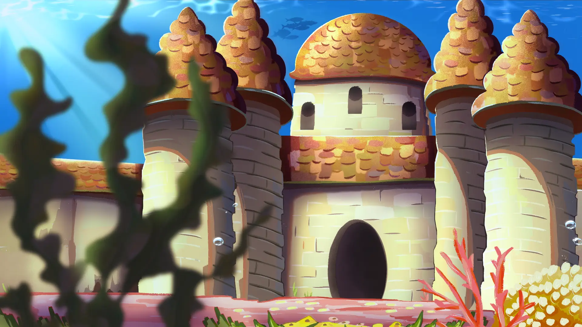 Thalassia is a region in Oniria inhabited by anthropomorphic marine creatures. It comprises two distinct areas: a surface zone featuring a beach and a cape called Butterfly Cove, and an aquatic zone that houses the castle of Nero, the imposing Orca Emperor King of the seas. This area was developed earlier in the Oniria project, resulting in well-defined and finalized environments.
