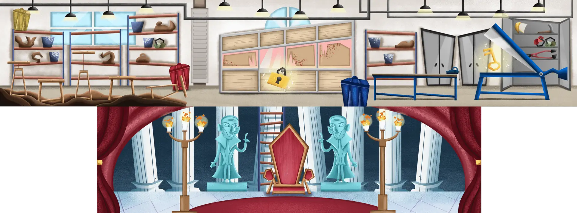 Background design for a platformer video game based on the University of Fine Arts of Granada. The setting depicts the sculpture classroom area, with access to the final boss zone located beneath it, secured by a large padlock. To progress to the next stage, players must obtain the key while avoiding the machines in the sculpture studio.